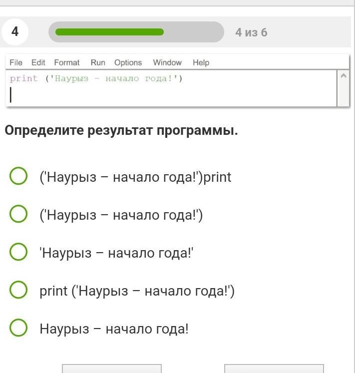 Определите результат программы. О ('Наурыз - начало года!')print О ('Наурыз – начало года!') о 'Наурыз - начало года!' - о print ('Наурыз - начало года!') О Наурыз - начало года!