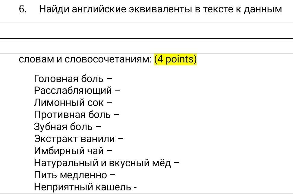 срочно 6. Найди английские эквиваленты в тексте к данным словам и словосочетаниям: Головная боль Расслабляющий Лимонный сок Противная боль - Зубная боль - - Экстракт ванили Имбирный чай - Натуральный и вкусный мëд - Пить медленно - Неприятный кашель -