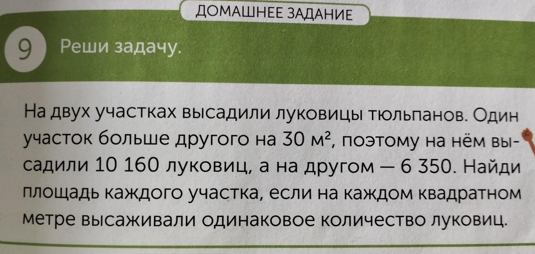 ДОМАШНЕЕ ЗАДАНИЕ 9 Реши задачу. На двух участках высадили луковицы тюльпанов. Один Участок больше другого на 30 м², поэтому на нём вы- садили 10 160 луковиц, а на другом 6 350. Найди площадь каждого участка, если на каждом квадратном метре высаживали одинаковое количество луковиц. -