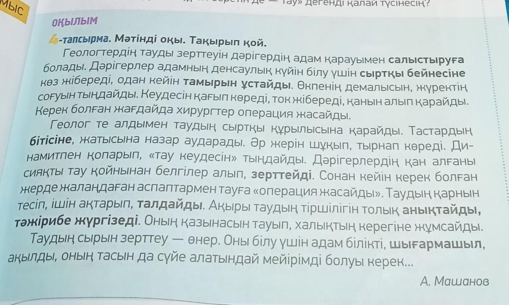 геолгтердің тауды зерттеуінен дәрігердің адам қарауымен салыстыруға болады.Дәрігерлер адамның денсаулық күйін білу үшін сыртқы бейнесіне көз жібереді одан кейін тамырын ұстайды. Геолог те алдымен таудың сыртқы құрылысфна қарайды