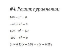 #4. Решите уравнения: 169 - x² = 0 -49 + x² = 0 169 - x² = 69 100 - x² = 0 (x-0.5)(x+0.5) - x(x-0.25)