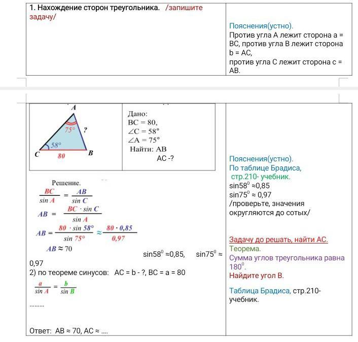 где а=ВС=80; sin∠A≈0,97; sin∠B≈0,73 смотрим в таблицу Брадиса на странице 210 вашего учебника.