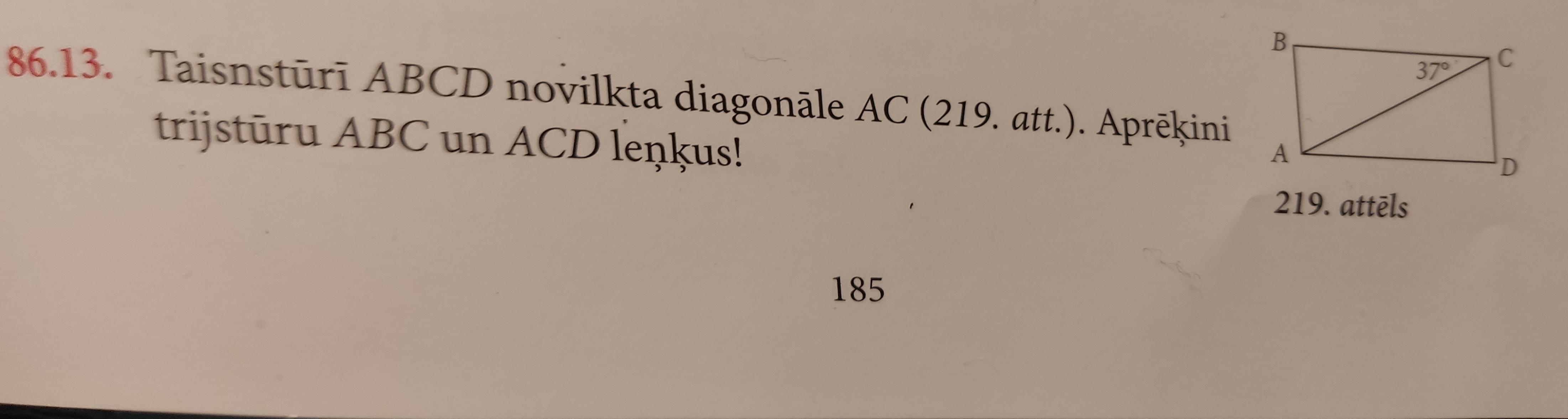 В прямоугольнике ABCD проведена диагональ AC (рис. 219). Вычислите углы треугольников ABC и ACD.