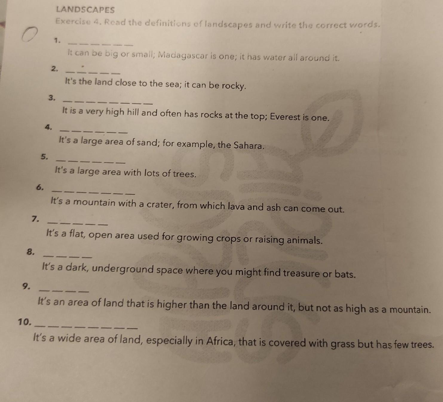 8. LANDSCAPES Exercise 4. Read the definitions of landscapes and write the correct words. 9. It can be big or small, Madagascar is one; it has water all around it. It's the land close to the sea; it can be rocky. It is a very high hill and often has rocks at the top; Everest is one. It's a large area of sand; for example, the Sahara. we ya It's a large area with lots of trees. 7. It's a flat, open area used for growing crops or raising animals. It's a mountain with a crater, from which lava and ash can come out. It's a dark, underground space where you might find treasure or bats. It's an area of land that is higher than the land around it, but not as high as a mountain. 10.- It's a wide area of land, especially in Africa, that is covered with grass but has few trees.