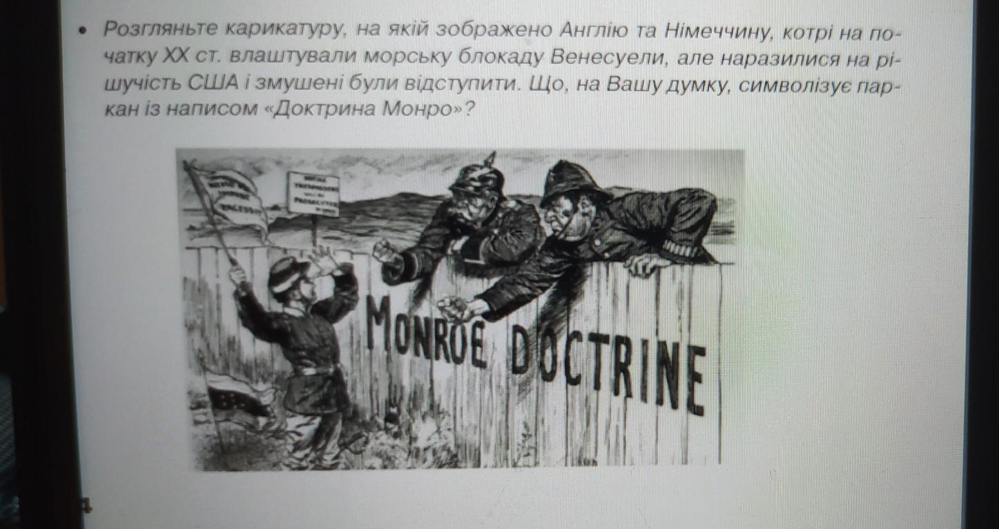 Суть доктрини Монро зводиться до того, що США бачили Західну півкулю сферою своїх інтересів та дотримувалися політики невтручання у європейські справи. Тому паркан із написом "Доктрина Монро" можна розцінювати як США, яка стала між Англією та Німеччиною, яка нібито хотіла їх розмирити, поставити між ними стіну перемир'я, але водночас використовувати це у деяких своїх інтересах.