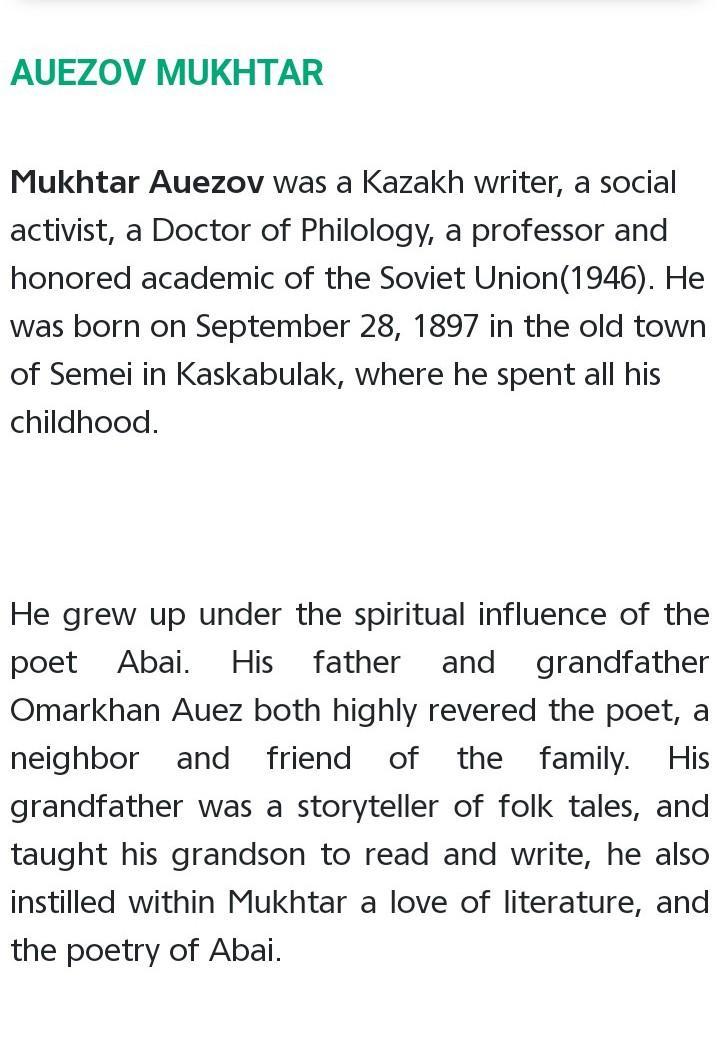 Мұхтар Әуезов был казахским писатели,и он обществянный деятель врач писхологом, а его профессер... Лень обьеснять