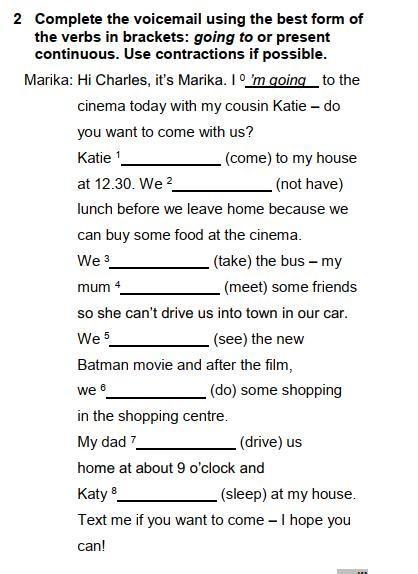 2 Complete the voicemail using the best form of the verbs in brackets: going to or present continuous. Use contractions if possible.