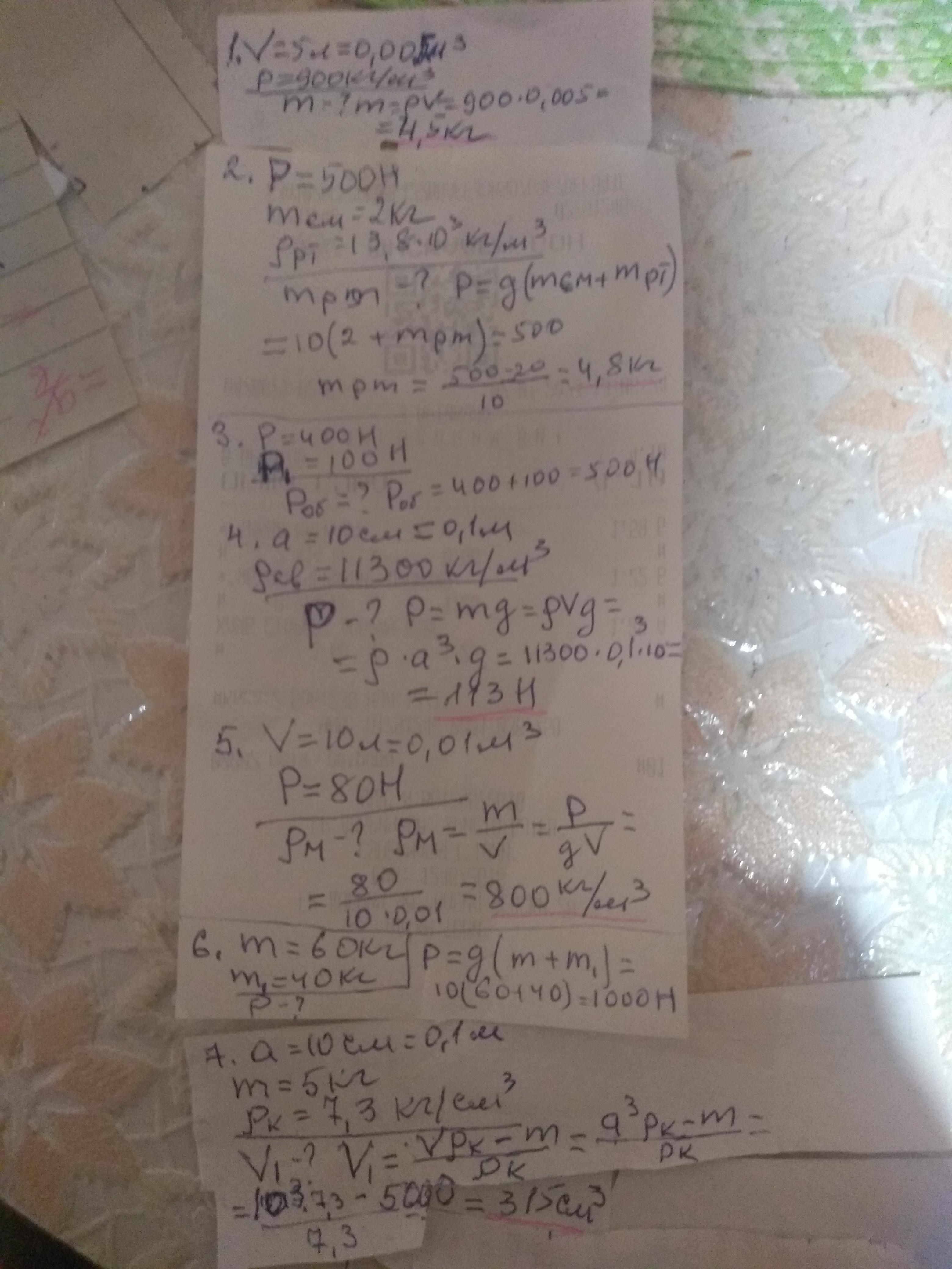 6. Массасы 60 кг адам, салмағы 40 кг жәшікті көтеріп келеді. Ол еденге қандай қысым күшін түсiредi? 7. Іші қуыс қалайыдан жасалған кубтың қырының ұзындығы 10см. Егер оның салмағы 51н болса, кубтың ішіндегі қуыстың көлемі кандай болар еді? рк=7,3 г/см3.