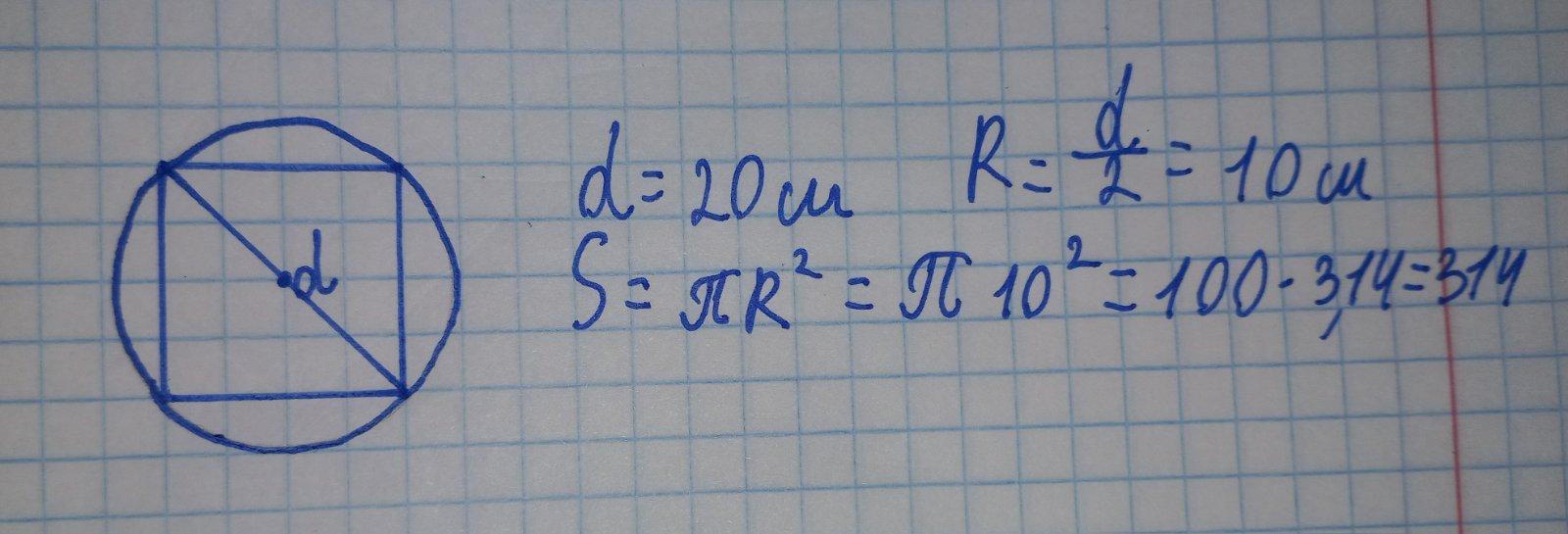 діагональ квадрата дорівнює 20 см квадрат треба покрити кругом найменшого радіуса чому дорівнює площа цього кута срочно допоможіть