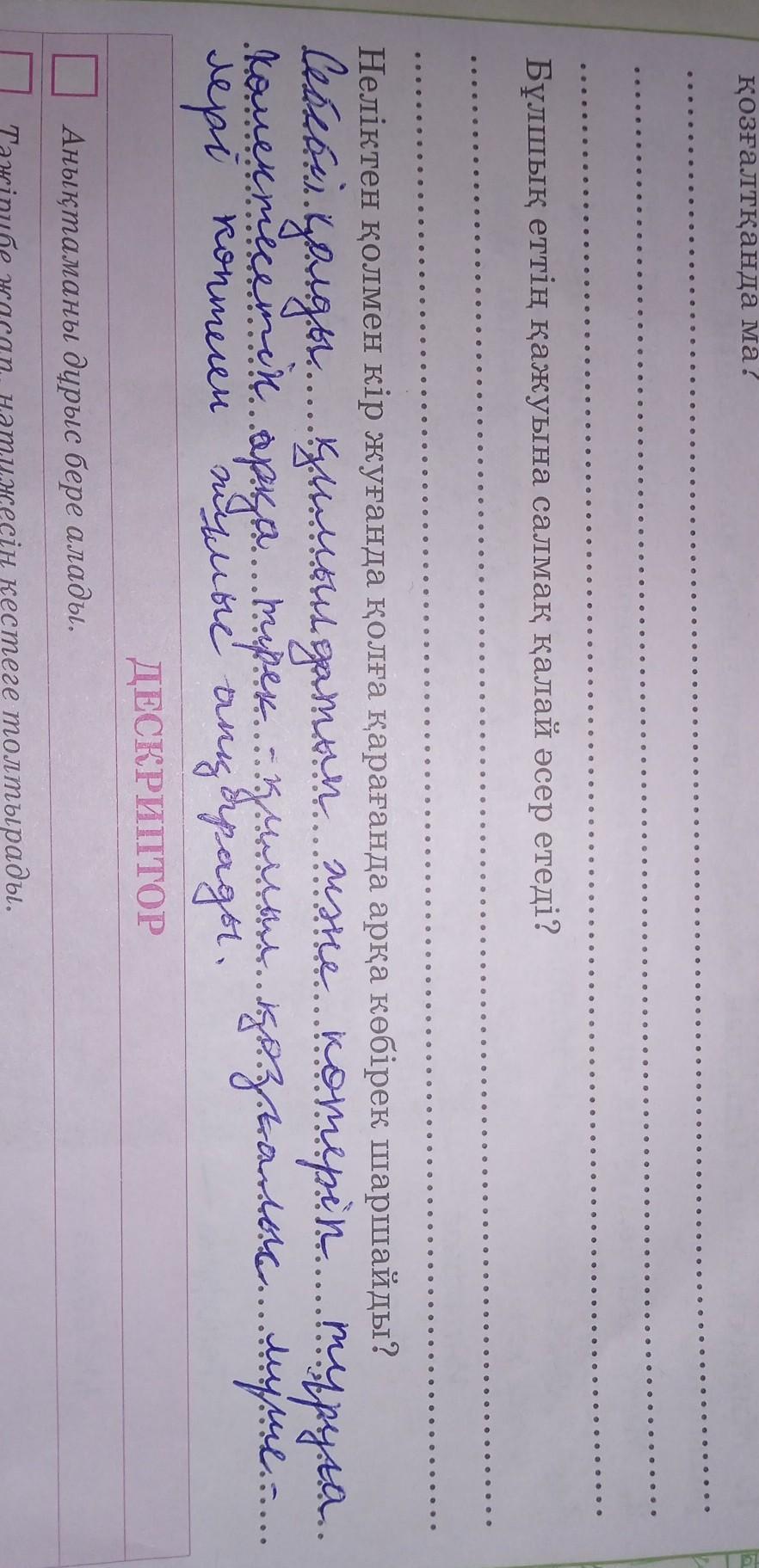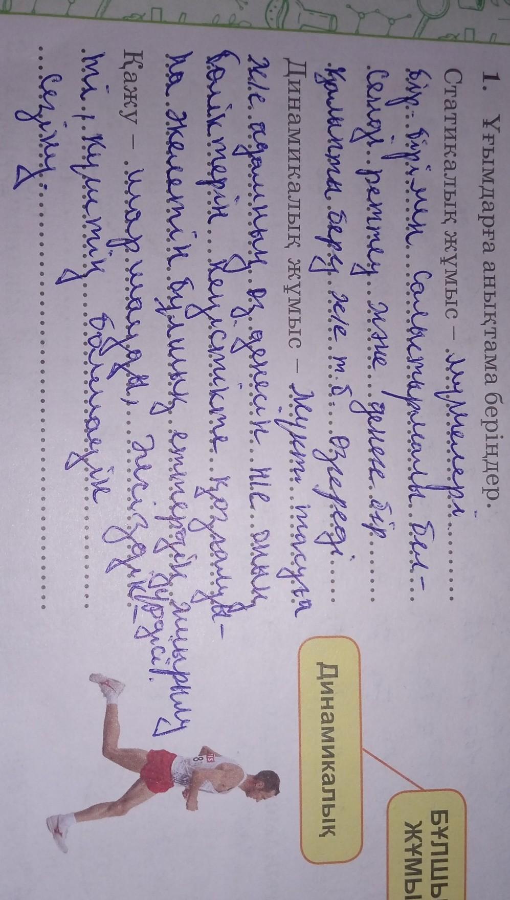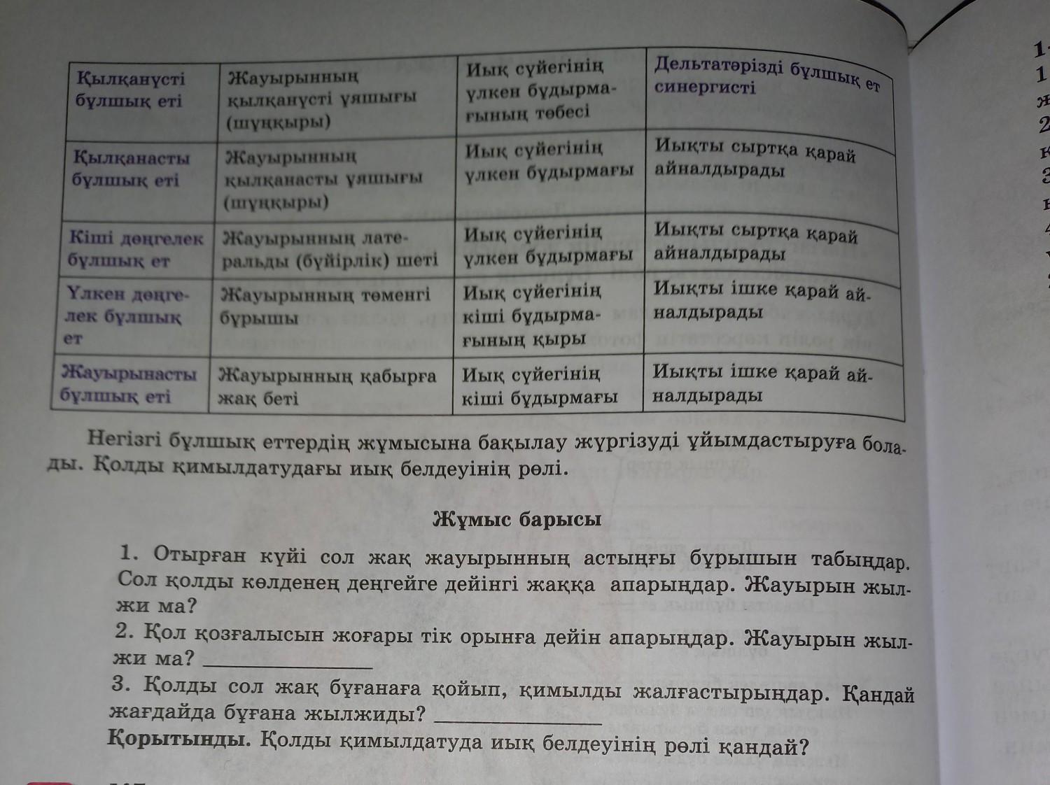 Жумыс барысы 1. Отырган куйi сол жак жауырыннын астынгы бурышын табындар. Сол колды көлденен денгейге дейiнгi жакка апарындар. Жауырын жыл жи ма? 2. Кол козгалысын жогары тiк орынга дейiн апарындар. Жауырын жыл жи ма? 3. Колды сол жак буганага койып, кимылды жалғастырындар. Кандай жагдайда бугана жылжиды? Корытынды. Колды кимылдатуда иык белдеуiнiн релi кандай? помогите
