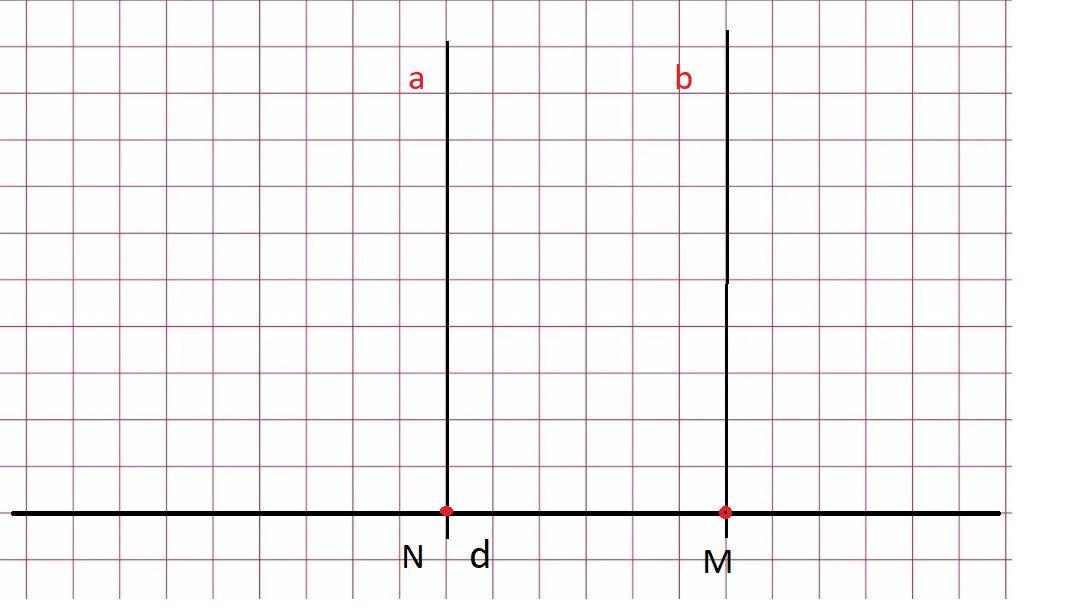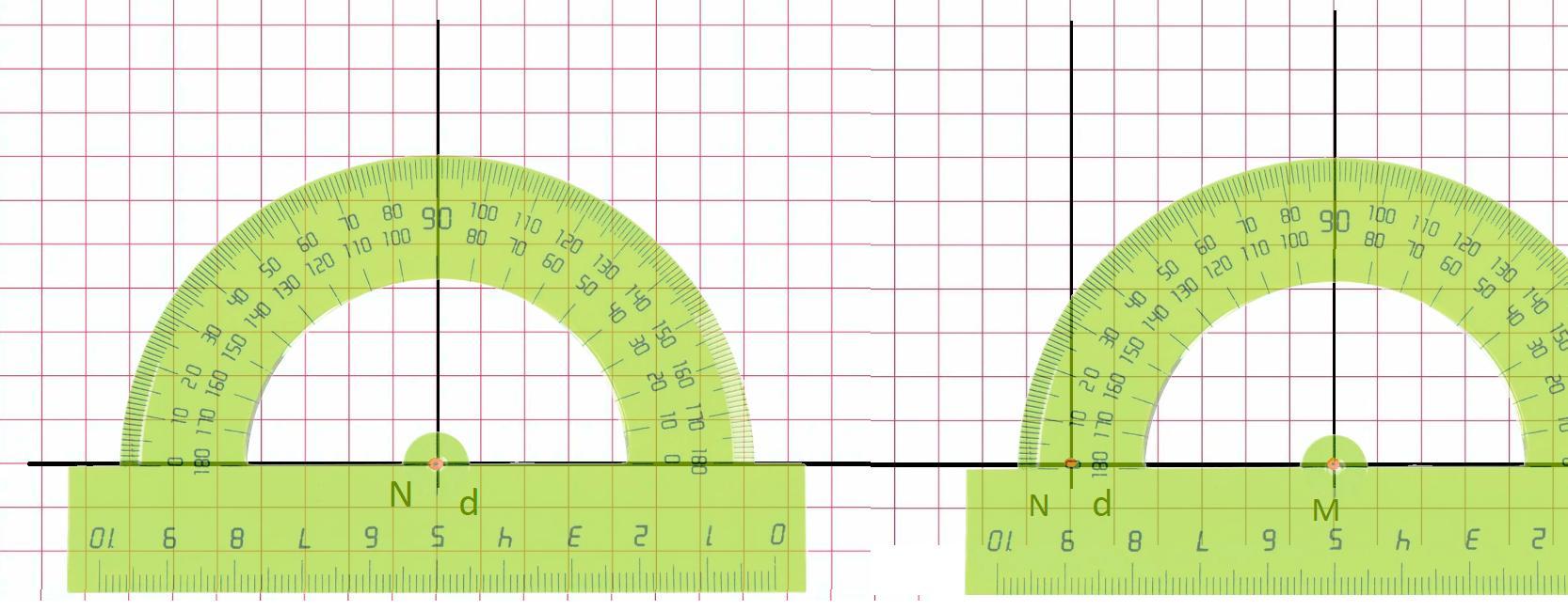 Накресли пряму d. Побудуй точки N i M, що належать їй. Через ці точки за допомогою транспортира проведи прямі, перпендикулярні до прямої d. Чи є серед отриманих прямих паралельні?