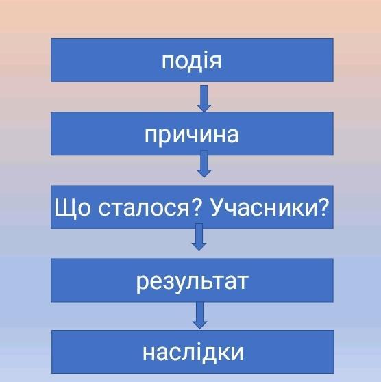 Оберіть будь-яку історичну подію з історії України. Дослідіть її за схемою. (Не больше 1 строчки на каждое)