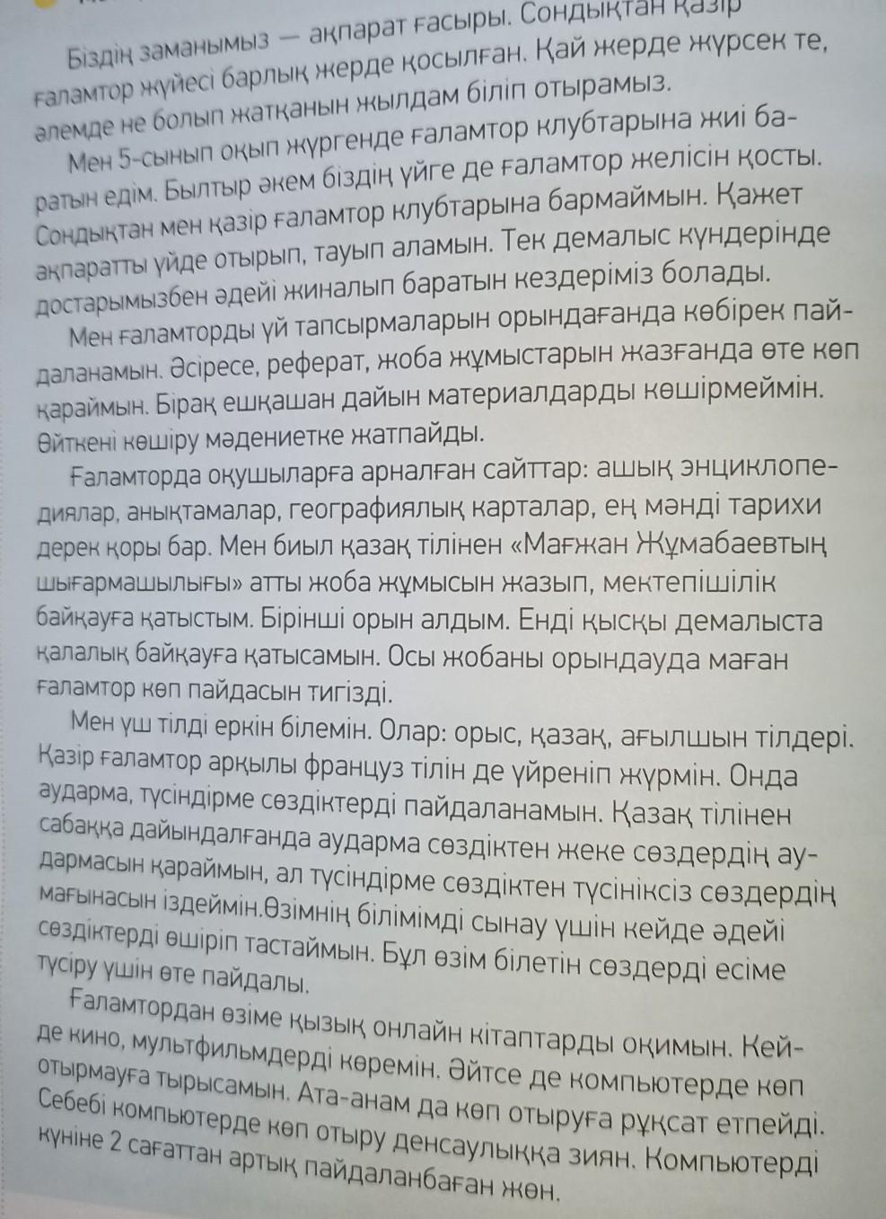 Қай үш тілде еркін сөйлейді (орыс, ағылшын, қазақ) Интернетте мектеп оқушыларына арналған қандай сайттар бар (энциклопедиялар, анықтамалар, карталар) Қай сыныпта интернет үйірмелерге барды (5 сыныпта Енді неге интернет клубтарға бармайсың? (әкесі интернетке қосылды)