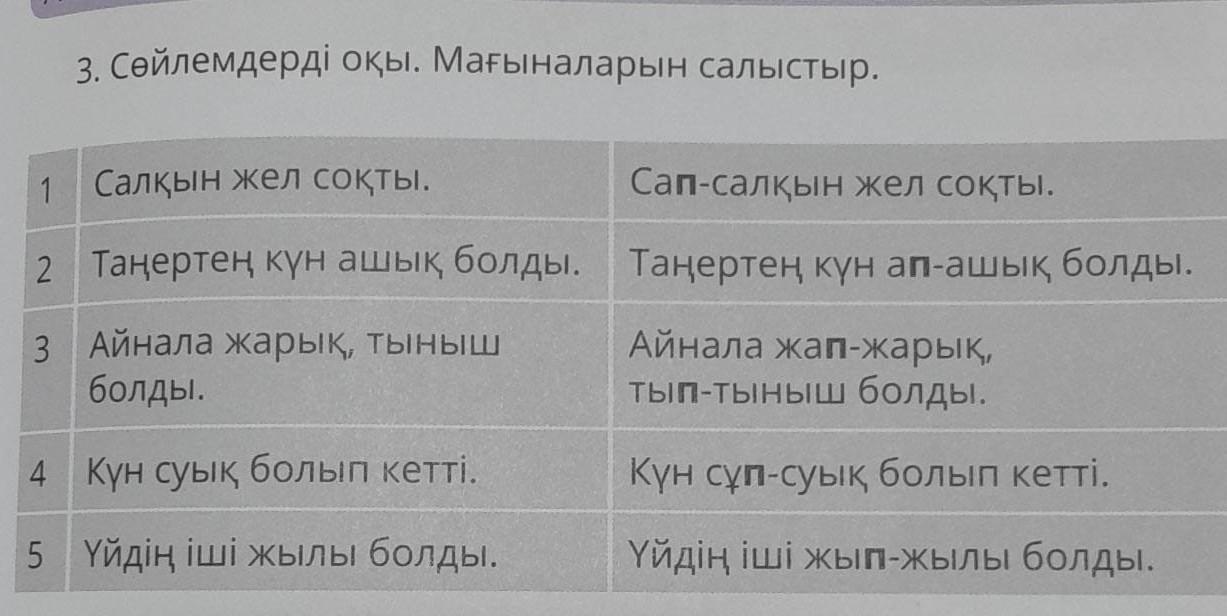 3. Сөйлемдерді оқы. Мағыналарын салыстыр. 1 Салқын жел соқты. Таңертең күн ашық болды. 2 3 Айнала жарық, тыныш болды. Сап-салқын жел соқты. Таңертең күн ап-ашық болды. Айнала жап-жарық, тып-тыныш болды. 4 5 күн суық болып кетті. Үйдің іші жылы болды. Күн сұп-суық болып кетті. Үйдің іші жып-жылы болды.