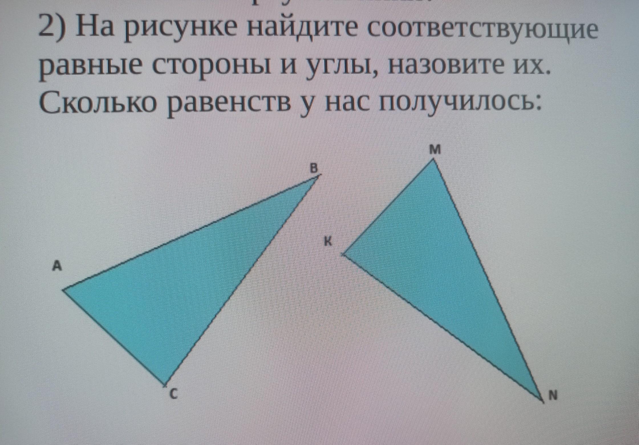 2) На рисунке найдите соответствующие равные стороны и углы, назовите их. Сколько равенств у нас получилось: A B K M N