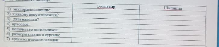 Nel-заполните таблицу: 1) месторасположение: 2) к какому вску относится? 3) Находки? 4) археолог: 5) количество могильников: 6) размеры главного кургана: 7) археологические находки: Бесшатыр Шиликты