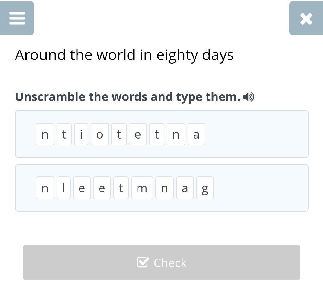 Around the world in eighty days Unscramble the words and type them. ◄ ntiotetna nieet mna ag