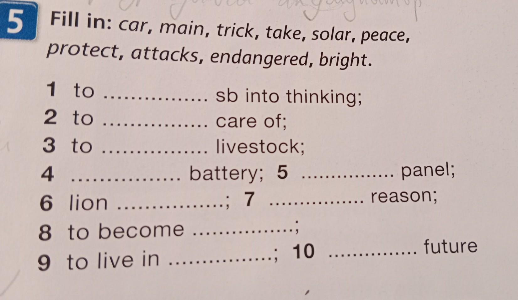 ПОМОГИТЕ ПОЖАЛУЙСТА СРОЧНО ДАМ 45 БАЛОВ!!!!!!! 5 u Fill in: car, main, trick, take, solar, peace, protect, attacks, endangered, bright. 1 to 2 to 3 to ... 4 6 lion 8 to become ... 9 to live in ........ ... sb into thinking; ... care of; livestock; ... battery; 5 ... ............. 7 .; 7 .... panel; ... reason; ...; 10 ....... ... future