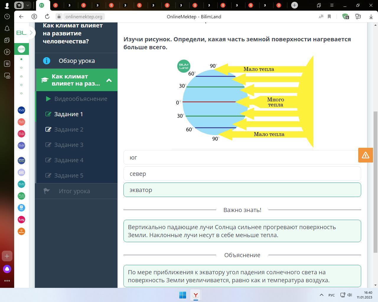 Изучи рисунок. Определи, какая часть земной поверхности нагревается больше всего. BILIM Land 30° 0° 30° 60⁰ 60⁰ экватор север юг 90° 90° Мало тепла Много тепла Мало тепла