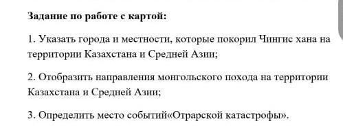 Задание по работе с картой: 1. Указать города и местности, которые покорил Чингис хана на территории Казахстана и Средней Азии; 2. Отобразить направления монгольского похода на территории Казахстана и Средней Азии 3. Определить место событий Отрарской катастрофы».