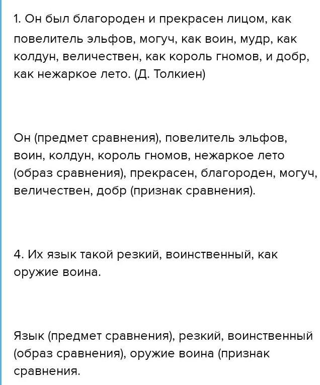 300. Найдите сравнения, назовите предмет, признак и образ сравнения. Образец : Он был могуч, как воин. — Он (предмет сравнения), воин (образ сравнения), могуч (признак сравнения). 1. Толкиенисты берут имена героев, место действия, как в романе Д. Толкиена, и проводят состязания, вовремя которых они должны ориентироваться на местности, сражаться на мечах. 2. Группа молодых людей — поклонников романов Д. Толкиена — выезжает в лес и разыгрывает там сценки, подобные сценам в романе.