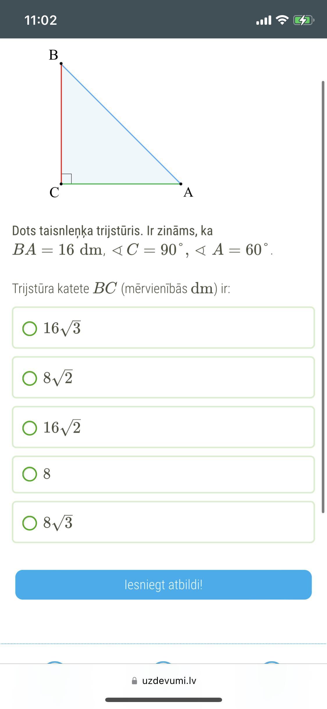 BC=BA•sin∠A=16•sin60=16•√3/2=8√3 dm