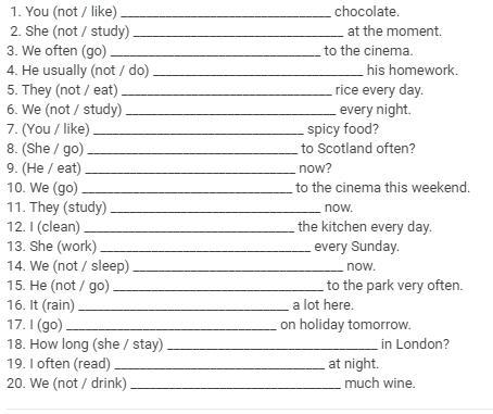 Відповідь:1. Don't like 2.Doesn't studying 3. Go 4. Doesn't do 5. Don't eat 6. Don't study 7. Do you like 8. Does she go 9. Does he eat 10. We are going 11. Are studying 12. Clean 13.works 14. Are not sleeping 15. Doesn't go 16. Rains 17. I'm going 18. Did she stay или Does she stay 19. Read 20. Don't