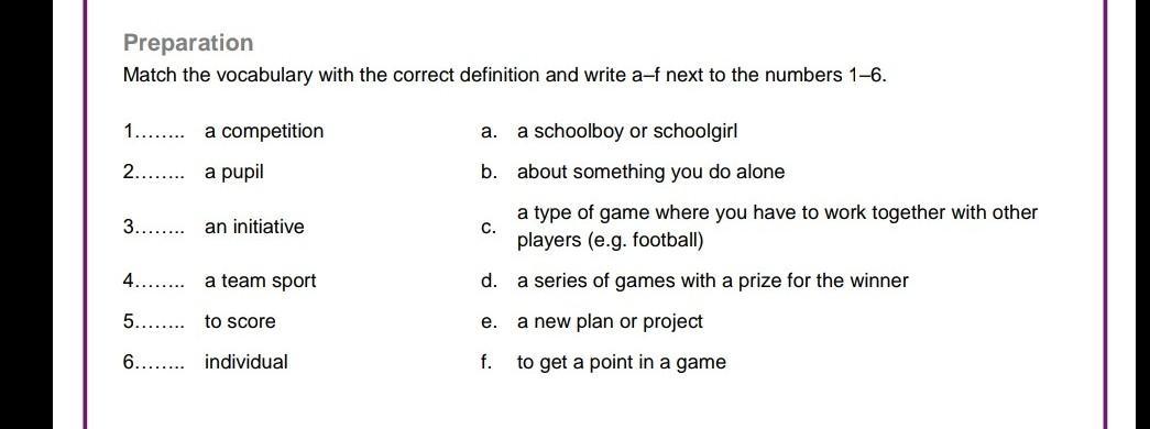 Preparation Match the vocabulary with the correct definition and write a-f next to the numbers 1-6. 1........ a competition 2. a pupil 3........ an initiative 4........ a team sport 5........ to score 6........ individual a. b. C. d. a series of games with a prize for the winner a new plan or project to get a point in a game e. a schoolboy or schoolgirl about something you do alone a type of game where you have to work together with other players (e.g. football) f. пожалуйста срочно. дам хорошое количество баллов
