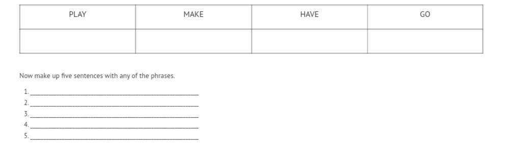 Complete the table with the words. Make up five sentences with any of the phrases.