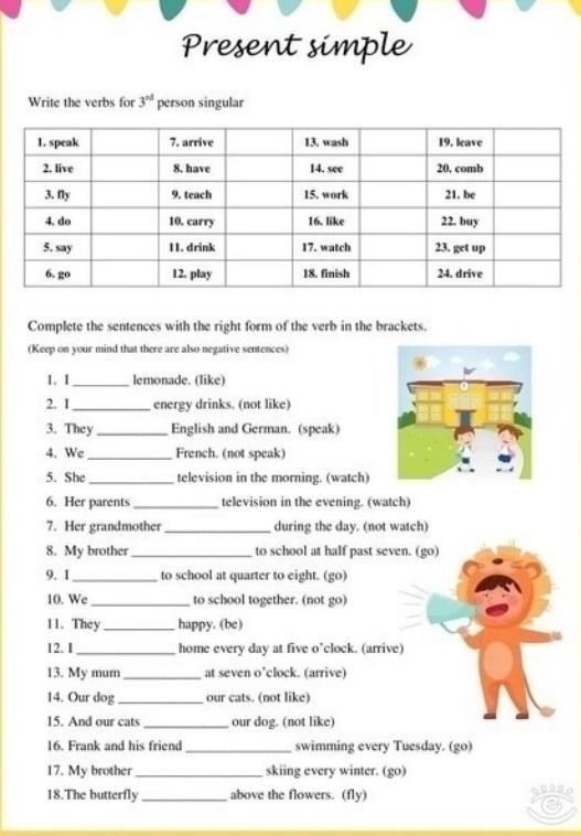 в первом задании ко всем словам добавь ing в конце без пропуска, пример Flying, НО если слово заканчивается на i, e, y добавляй ng в конце, пример: likeng