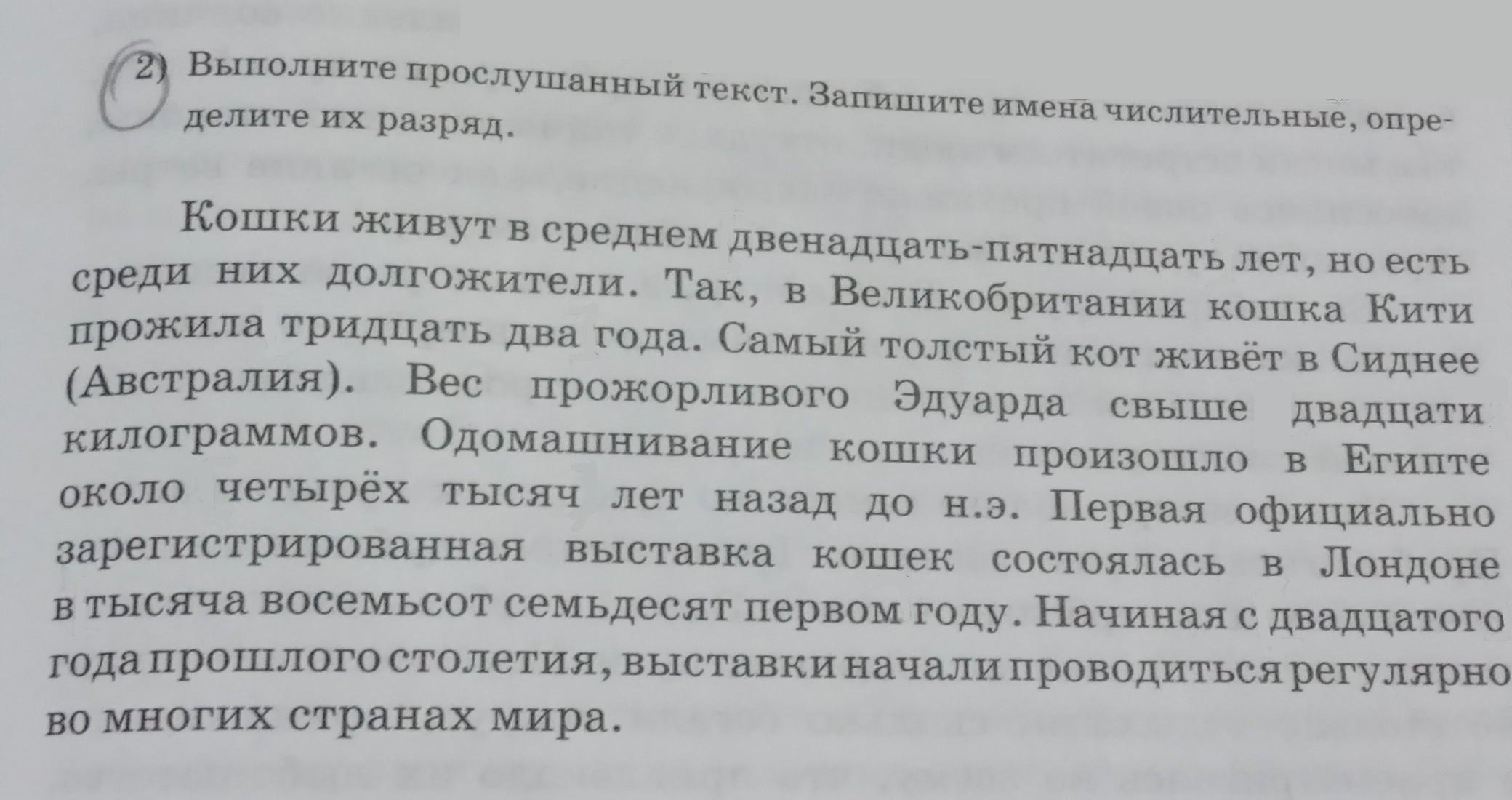 выполните прослушанный текст. Запишите имена числительные, опре- делите их разряд. Кошки живут в среднем двенадцать-пятнадцать лет, но есть среди них долгожители. Так, в Великобритании кошка Кити прожила тридцать два года. Самый толстый кот живёт в Сиднее (Австралия). Вес килограммов. около четырех прожорливого Эдуарда свыше двадцати Одомашнивание кошки произошло в Египте тысяч лет назад до н.э. Первая официально выставка кошек состоялась в Лондоне зарегистрированная в тысяча восемьсот семьдесят первом году. Начиная с двадцатого года прошлого столетия, выставки начали проводиться регулярно во многих странах мира.
