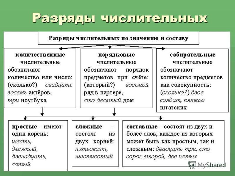 Числительные разделяются на разряды по нескольким признакам (см. приложение).