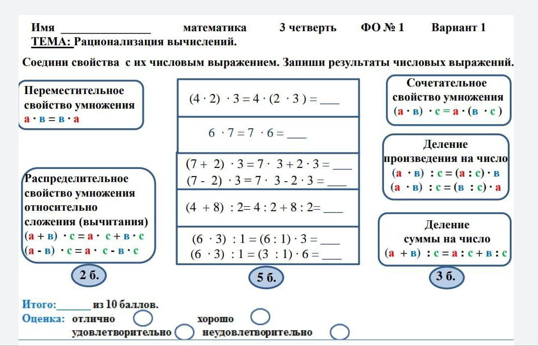 Имя математика 3 четверть фо № 1 Вариант 1 ТЕМА: Рационализация вычислений. Соедини свойства с их числовым выражением. Запиши результаты числовых выражений. Сочетательное свойство умножения (а.в) .c=a. (в.с) Переместительное свойство умножения a.B-B. а Распределительное свойство умножения относительно сложения (вычитания) (a + в) . c = a c+вс (а - в) • c=a. с-вс 26. Итого: Оценка: из 10 баллов. отлично удовлетворительно (4-2) 34 (2·3)=. 6 7 7 6= (7+2) 3 7.3 +2.3= (7-2) 37-3-2-3= (4 + 8) 2= 4:2+8:2= : (63) 1 (6 3) 1 хорошо (6:1) 3 = (3:1) 6= 5 6. неудовлетворительно Деление ПРОИЗВЕДЕНИя на число (a . B) : c = (a : c) . в (а . B): c = (в: с) . а Деление суммы на число (а +в) : c =а:с+в:с 36.
