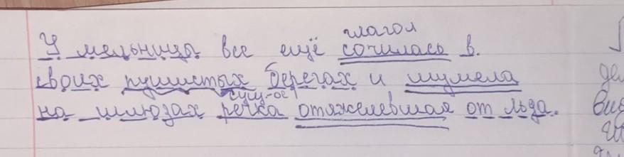 У мельницы всё ещё сочилась в своих пушистых берегах и шумела на шлюзах речка отяжелевшая от льда. (обязательно надпишите, какой частью речи выражены члены предложения;