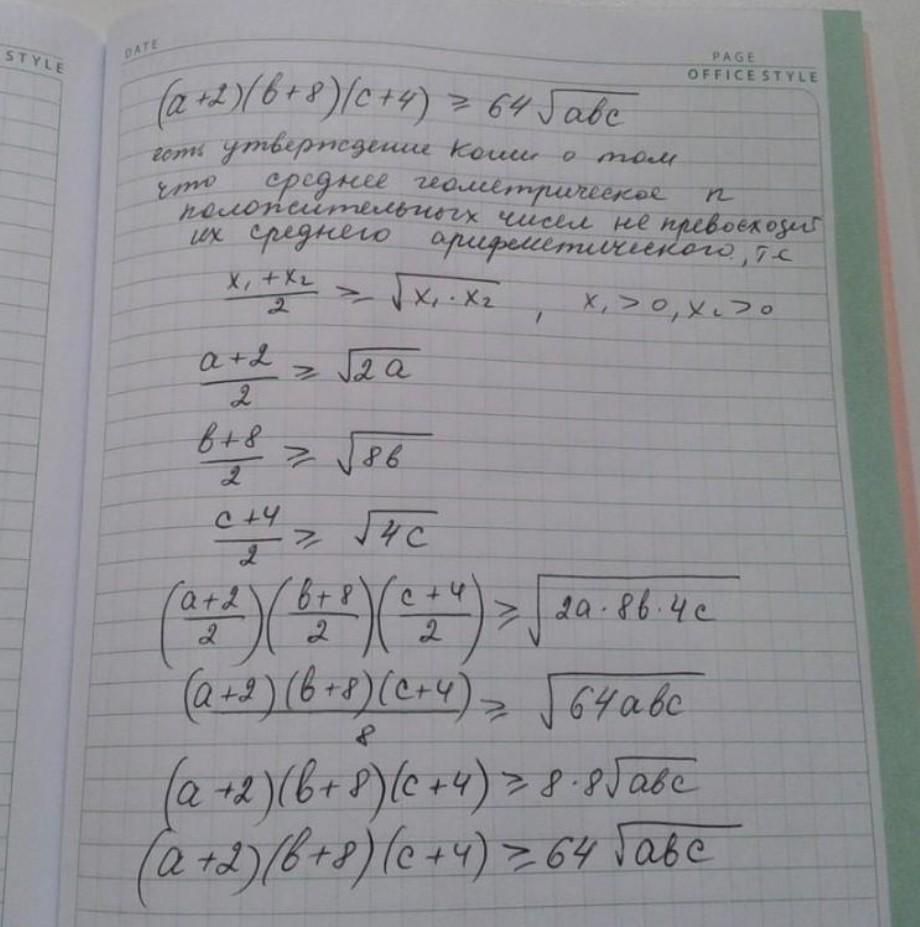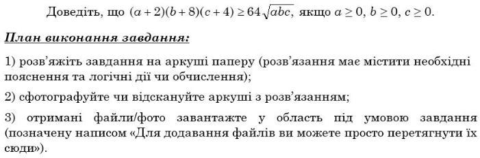 Доведіть, що (а+2)(b + 8)(c+ 4) > 64 abc, якщо a > 0, b> 0, с > 0. План виконання завдання: 1) розв'яжіть завдання на аркуші паперу (розв'язання мае містити необхідні пояснення та логічні дії чи обчислення);