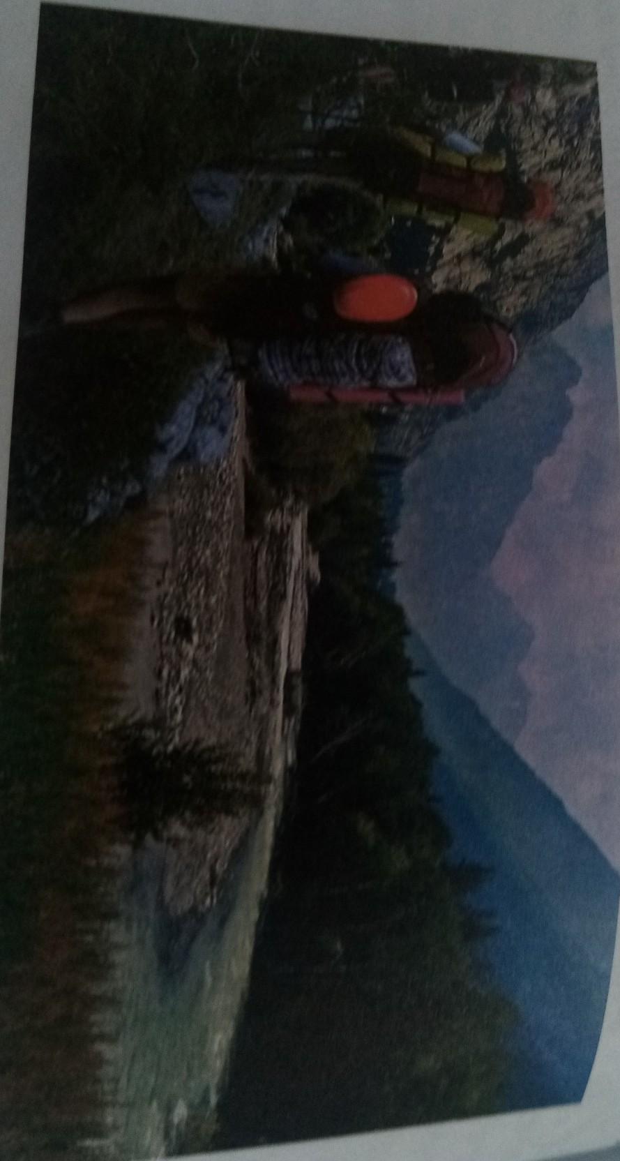 Мен мнау суретте екі туристі көрдім. Олар екеу лер фотоға түседі. Арты жағында үлкен таулар бар. Олардың жанында орман бар. Астында озен отіп тур.Менің ойымша олар өте жақсы демалыс күндерді өткізді.