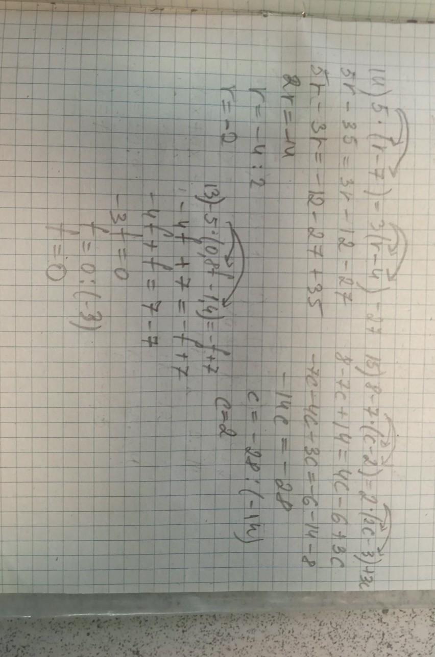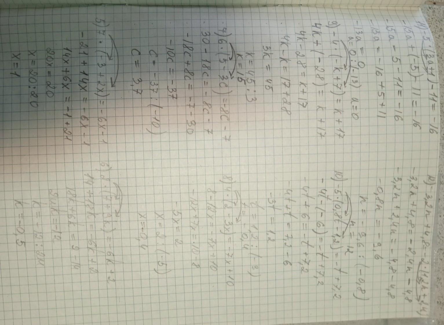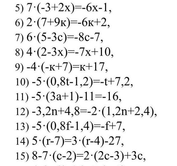 5) 7 (-3+2x)=-6x-1, 6) 2 (7+9k) -6K+2, 7) 6 (5-3c)=-8c-7, 8) 4 (2-3x)=-7x+10, 9) -4 (-K+7)=k+17, 10) -5 11) -5 (3a+1)-11=-16, 12) -3,2n+4,8=-2-(1,2n+2,4), 13) -5 (0,8f-1,4)=-f+7, 14) 5 (r-7)=3 (r-4)-27, 15) 8-7-(c-2)=2-(2c-3)+3c, (0,8t-1,2)=-t+7,2,