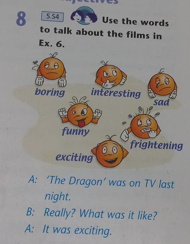 8 Use the words to talk about the films in Ex. 6. 120 5.54 boring funny interesting sad frightening exciting A: 'The Dragon' was on TV last night. B: Really? What was it like? A: It was exciting.