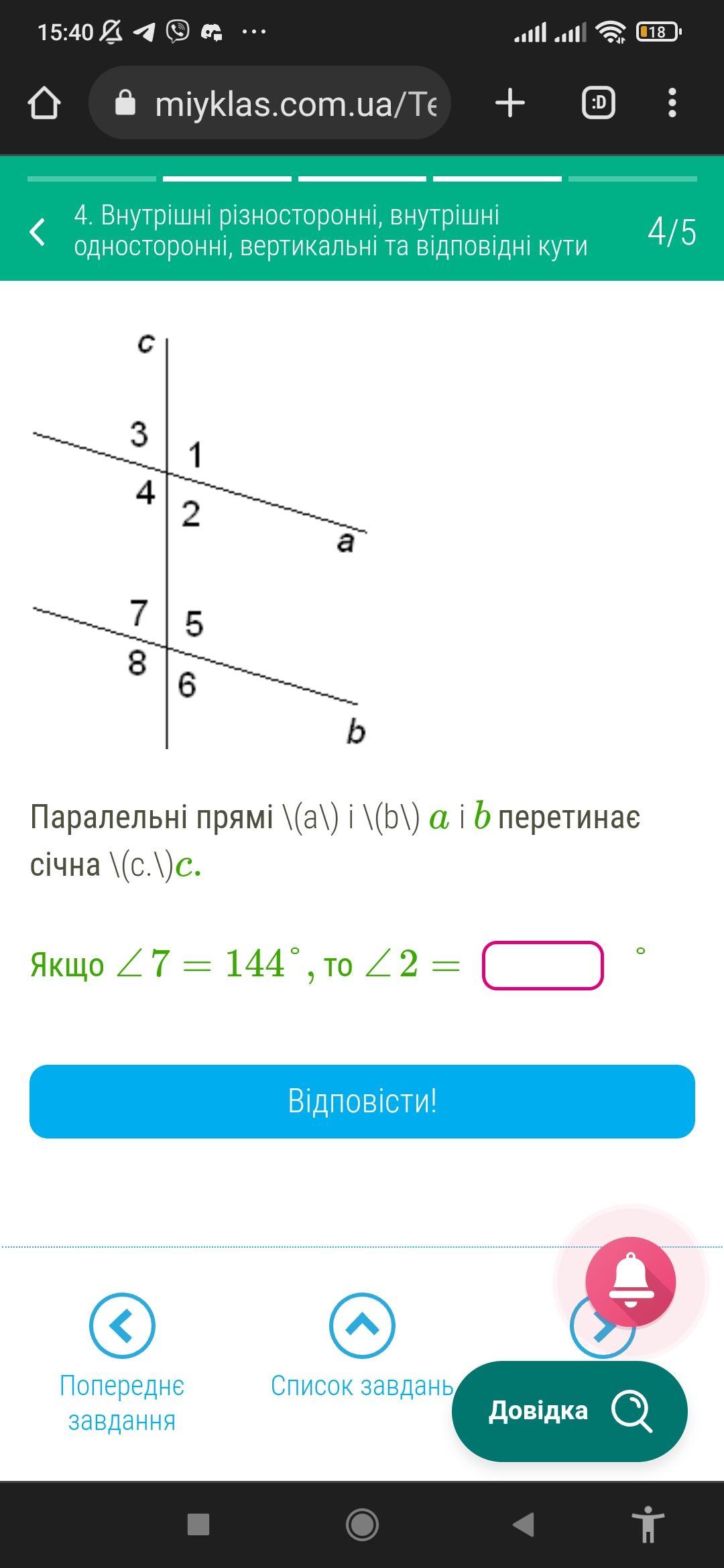 Исходя из того что a и b параллельны то можно делать вывод что линиия с секущая их делает равными угол 2 и угол 7 ибо они являются накрест лежащими. Соответсвенно если угол 7 равно 144 градусам то и угол 2 равно 144 градусам