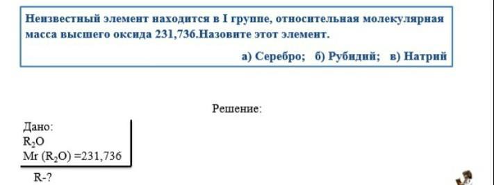 Неизвестный элемент находится в I группе, относительная молекулярная масса высшего оксида 231,736. Назовите этот элемент.
