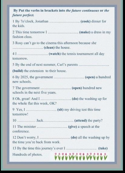 By Put the verbs in brackets into the future continuous or the future perfect. (cook) dinner for 1 By 7o'clock, Jonathan the kids. 2 This time tomorrow I fashion class. 3 Rosy can't go to the cinema this afternoon because she (clean) the house. (watch) the tennis tournament all day 41 tomorrow. 5 By the end of next summer, Carl's parents (build) the extension to their house. 6 By 2025, the government new schools. 7 The government schools in the next five years. 8 Oh, great! And I the whole flat this week, OK? 9 Yes, I tomorrow! Jack. 10 11 The minister conference. (make) a dress in my 12 Don't worry, I the time you're back from work. 13 By the time this journey's over I Hundreds of photos. (open) a hundred (open) hundred new (do) the washing up for (sit) my driving test this time (attend) the party? (give) a speech at the (do) all the washing up by (take) *********
