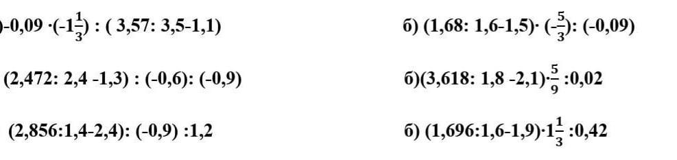 11. a)-0,09 -(-1¹) : ( 3,57: 3,5-1,1) 12.a) (2,472: 2,4 -1,3) : (-0,6): (-0,9) 13.a) (2,856:1,4-2,4): (-0,9) :1,2 6) (1,68: 1,6-1,5)· (~-³): (-0,09) 6)(3,618: 1,8-2,1):0,02 6) (1,696:1,6-1,9)-1¹:0,42 можно сделать по действиям.