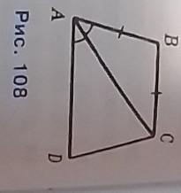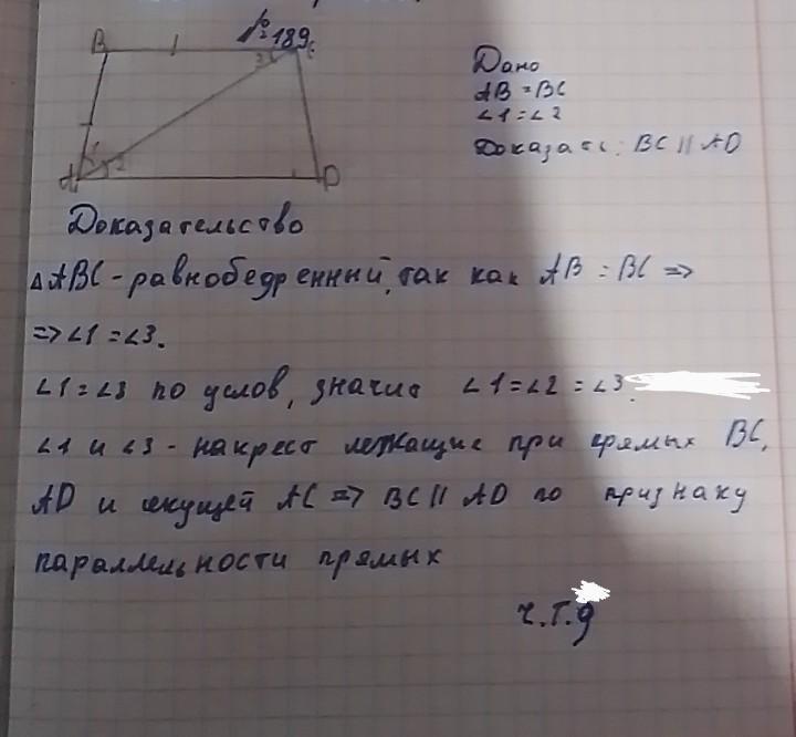 < ВАС = < САD. AB=BC, значит треугольник АВС равнобедренный. в равнобедренном треугольнике углы при основании равны, значит < ВАС=< ВСА => < CAD=< ВСА, а так как эти углы внутренние разносторонние и они равны, значит ВС||AD.