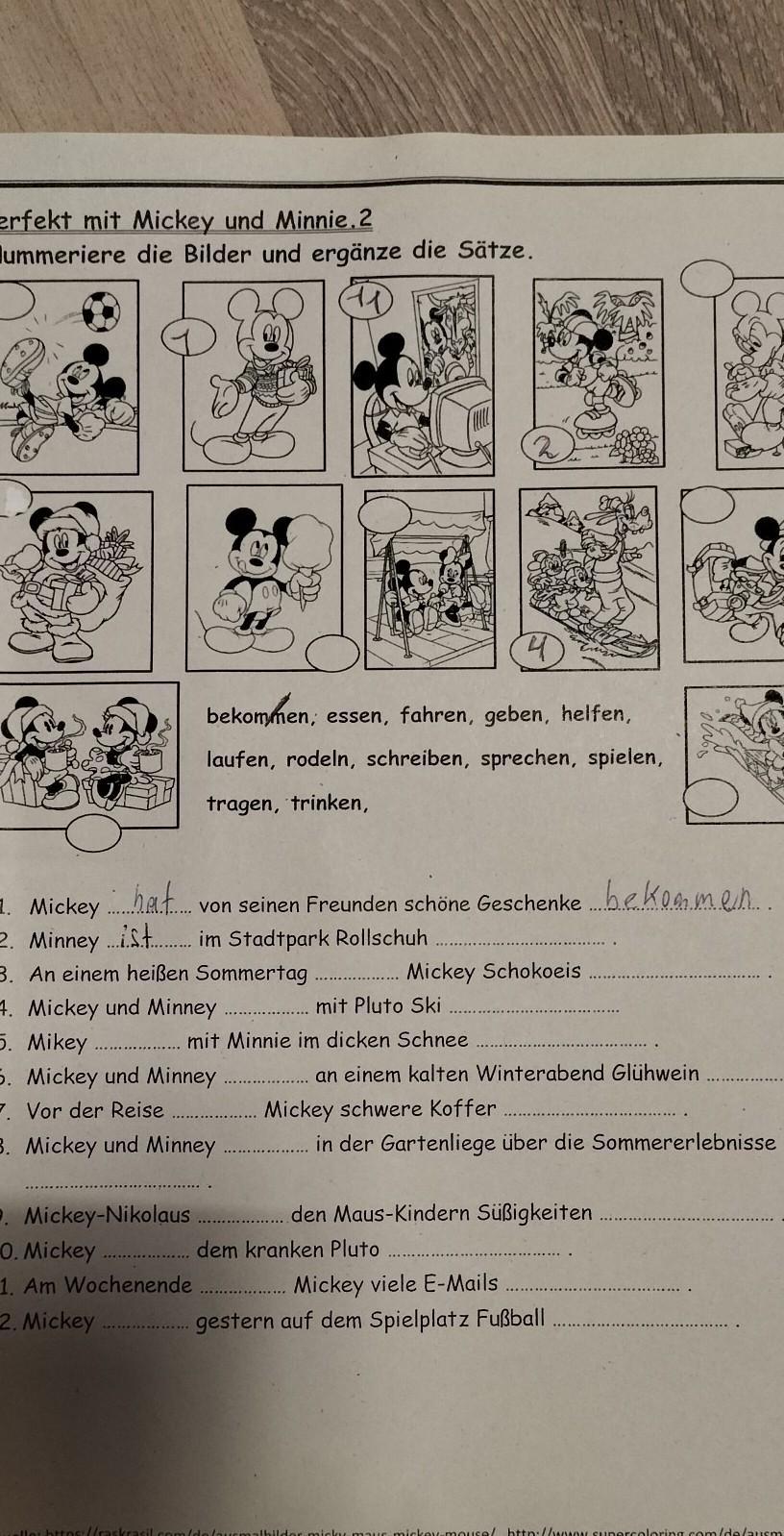 Варианты ответа: essen, fahren, geben, helfen, laufen, rodeln, schreiben, sprechen, spielen, tragen, trinken