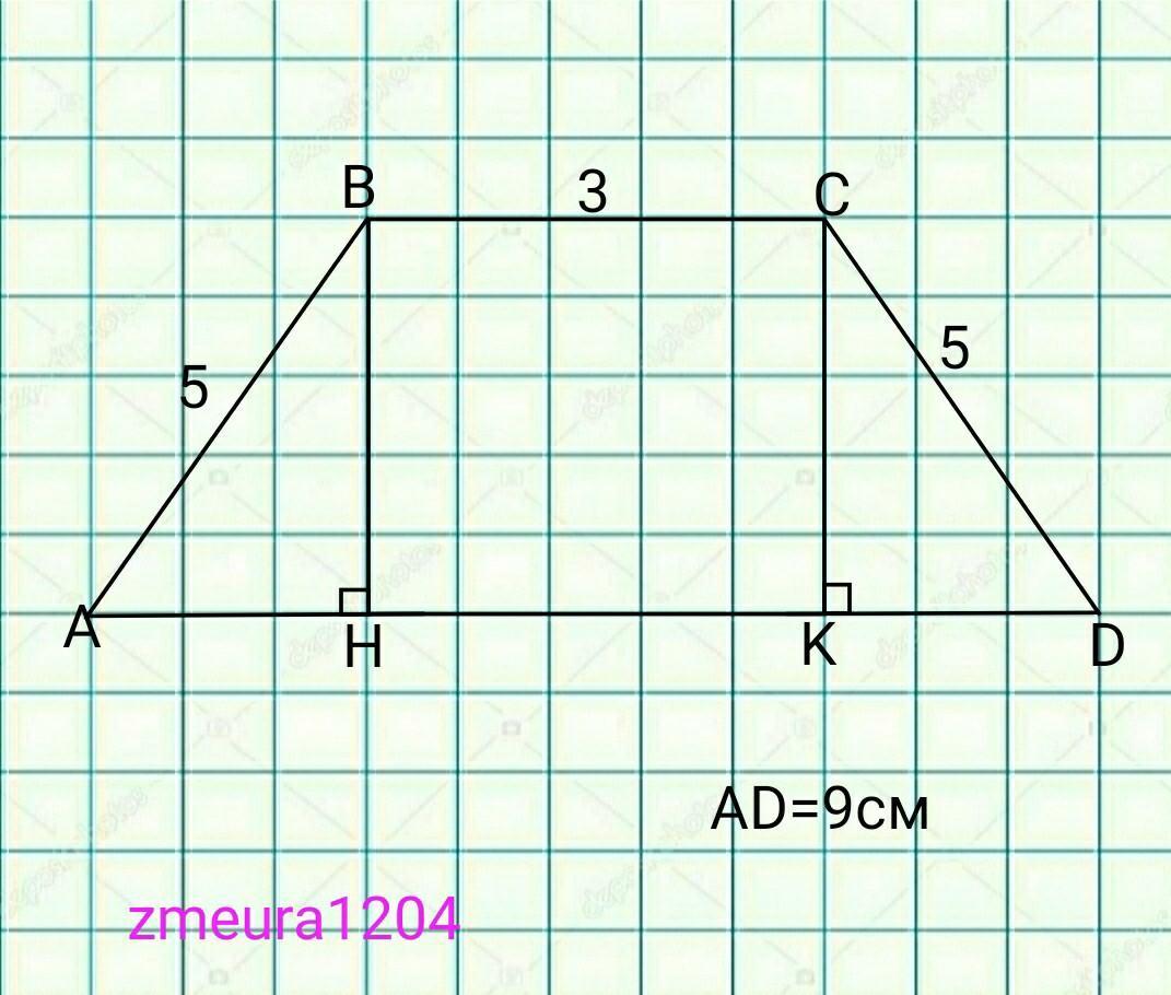 !!!СРОЧНО!!! У рівнобічній трапеції основи і бічна сторона відповідно дорівнюють 3 см, 9 см і 5 см. Знайти висоту трапеції
