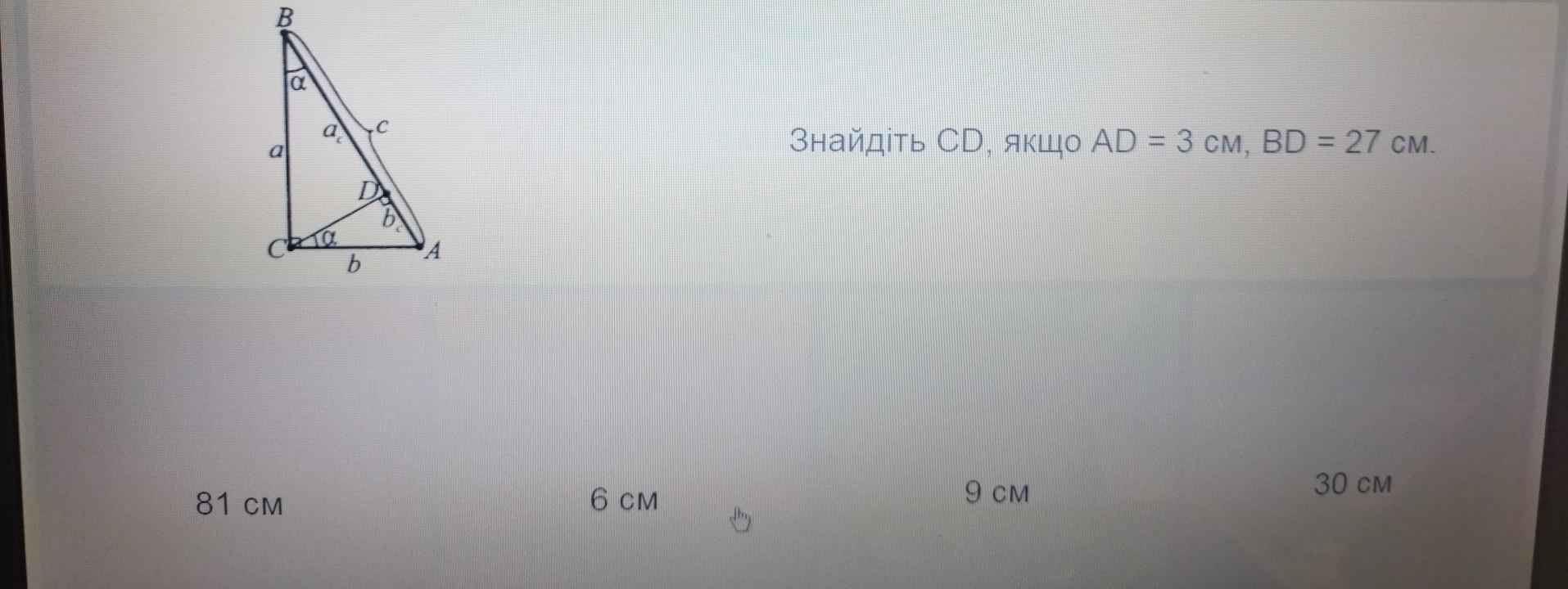 CD=√(AD*BD)=√(3*27)=√(3*3*9)=3*3=9см
