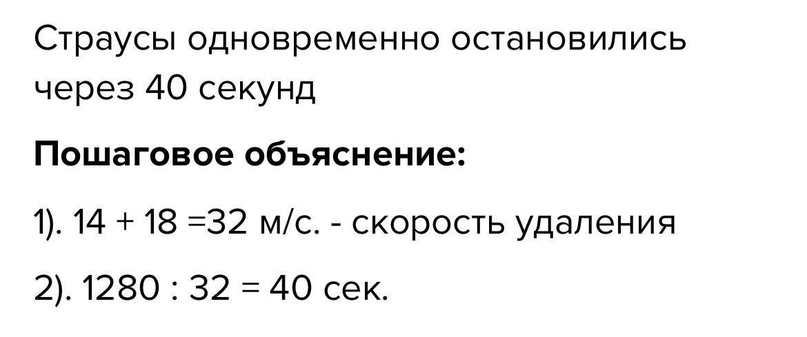Два страуси одночасно побігли від годівниці в протилежних напрямках зі швидкістями 14м/ с і 18м/с.Через який час страуси одночасно зупинились,якщо відстань між ними 1280м.