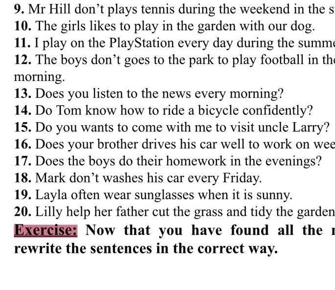 9. Mr Hill don't plays tennis during the weekend in 10. The girls likes to play in the garden with our dog 11. I play on the PlayStation every day during the su 12. The boys don't goes to the park to play football morning. 13. Does you listen to the news every morning? 14. Do Tom know how to ride a bicycle confidently 15. Do you wants to come with me to visit uncle Lan 16. Does your brother drives his car well to work on 17. Does the boys do their homework in the evening 18. Mark don't washes his car every Friday. 19. Layla often wear sunglasses when it is sunny. 20. Lilly help her father cut the grass and tidy the go срочноо даю 50баллов пожалуйста