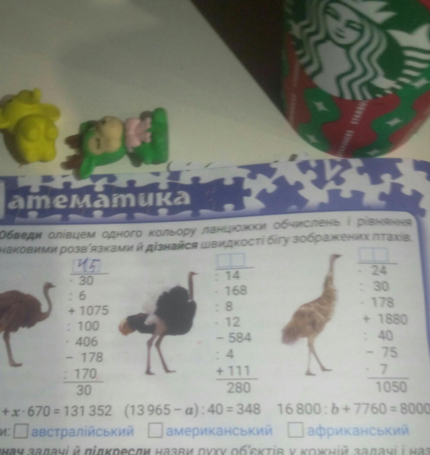 Ma amemamuka Обведи олівцем одного кольору ланцюжки обчислень і вн з однаковими розв'язками й дізнайся швидкості бігу зображених птахів 280-111×4+584/2×8/168×14