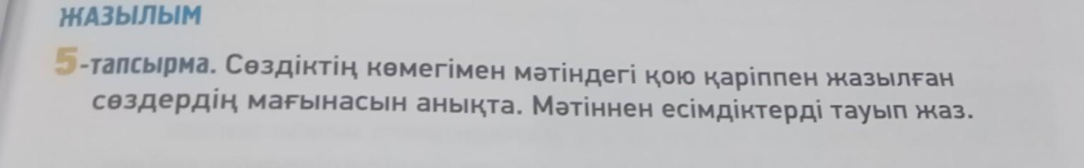 ЖАЗЫЛЫМ 5-тапсырма. Сөздіктің көмегімен мәтіндегі қою қаріппен жазылған сөздердің мағынасын анықта. Мәтіннен есімдіктерді тауып жаз.